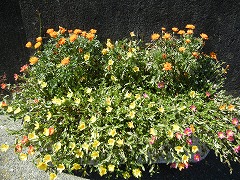 港に沿って花壇が置かれています。咲いている花はマリーゴールドとマツバボタンのようです。さりげなく置かれている花壇ですが、蒼い海とのコラボが本当に素敵でした。