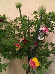 こちらは先生の田中さんの作品。ドウダンツツジ以外は、アリアム(ネギ)、ズッキーニ、ナデシコ、マリーゴールドなど、全て食べられる素材でデザインされています。