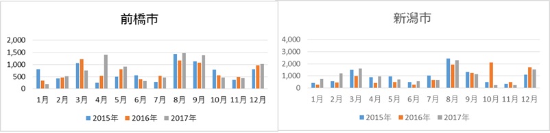 前橋市、新潟市。隣同士に並べてしまいましたが、仙台、福島、新潟は切花支出金額の多い都市なので、タテ軸の目盛が違うことにご注意ください。最大金額が4,000円となっています。(ほかの都市は2,000円にしています)。