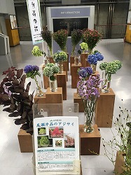 そして、大田市場の中央通路では、すっかり初秋のアイコンとなっている「尾瀬片品の花」。群馬県のJA利根沼田さまからのアナベル、空色アジサイ、コチナス(スモークツリー)などの名産品目が展示されています。