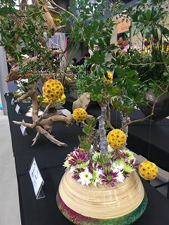 2階では、展示ばかりでなく愛知みなみさまのマムを使った作品コンペが行われており、フローリストさんたちが腕を振るった作品が陳列されています。
