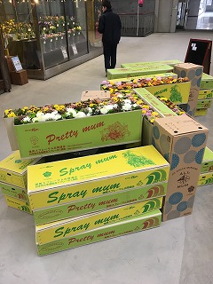 大田市場花き部では、仲卸通り中央部と2階中央通路との同時開催で、JA愛知みなみさまのマムのご紹介をしています。