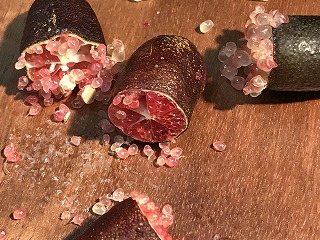 こちらはフィンガーライムと呼ばれる柑橘で、指ほどの果実にユニークな食感の巣仏部が詰まっています。