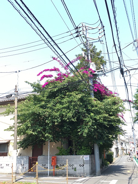 次はブーゲンビリア。天まで届けと言わんばかりに高い所まで伸びています。天まで伸びると巨人に会えるでしょうか。下を見ない、上を目指すいい花ですね。