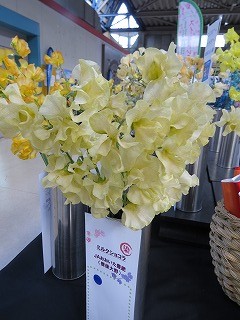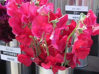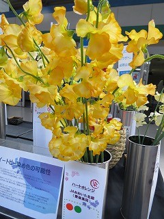 大田市場花き部中央通路では、1月21日スイートピーの日にちなみ種々のスイートピーが展示されています。そして今回のメインステージでは、染め品種人気コンテストが開催されています。