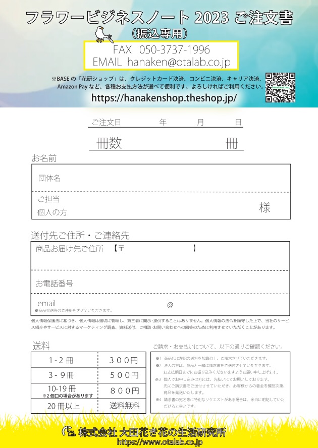 お陰さまで「フラワービジネスノート2023」が完成し、明日9月1日から販売を開始する運びとなりましたので、改めまして以下の通りご案内申し上げます。