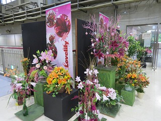 日本花き生産協会スプレーマム部会によるマムの展示、及びマムを使った作品コンペを同時開催中。