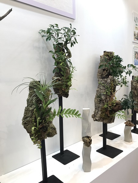 趣味の園芸の人気コーナー これカッコいいぜのコーナーもありました。写真はコルク付けにした観葉など。なんでもコルクにつけて楽しもうという提案。来場者は備え付けのスプレーで