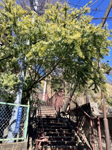 石段にかかる門かぶりの松のようなミモザアカシア。山裾の住宅から伸びた枝のつぼみは日照時間の関係でうっすらと色付いた程度。谷筋のような場所なので、つぼみも堅いでしょうか。