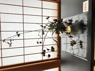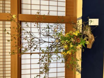 逆光でゴメンナサイ。ロウヤ柿と、シュウメイギクが使われた作品(塚越応駿 作)