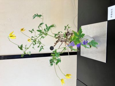 柔らかい線が本当に美しい (黄色クレマチス タングチカ系? 紫トリカブト)(伊藤庭花 作)