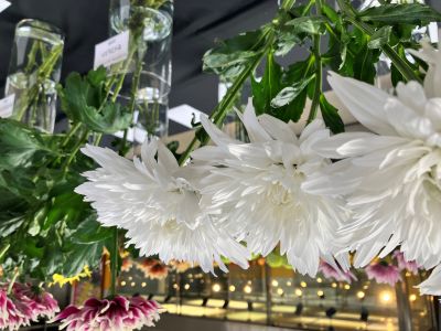展示してあるディスバッドマム(以下、「マム」と略しますね)の種類はデコラ咲き、ポンポン咲き、スパイダー咲き、様々。色も花弁の表裏が異なるマムならではのリバーシブル柄から絞り柄とあります。花弁に光沢感がある品種もあります。種類の多様性に加えてきらきらとした感じが加わると、展示もスター共演の様相です。