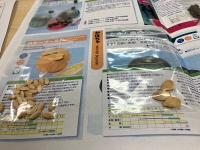 それも巨大なタネです。細かーいタネもうれしいですが、大きなタネっていうだけでなんだか楽しい。拝見しましたら、カボチャとスイカのタネでした。