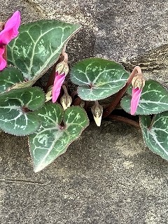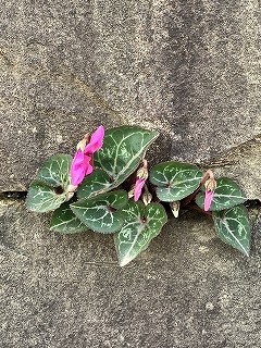 壁面のブロックの間から、なんとガーデンシクラメンが生えてきているではありませんか!サンドイッチのパンの間からはみ出したクリームのように、横長にムニッと。